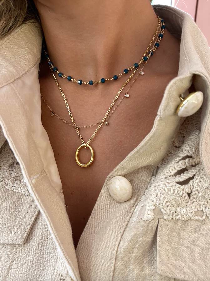 El choker Remy, bañado en oro de 24K, destaca por su diseño sofisticado y elegante. Los cristales azules incorporados aportan un toque de color vibrante que realza su delicadeza, haciendo de esta pieza un complemento ideal para ocasiones especiales y para quienes valoran la distinción en cada detalle.